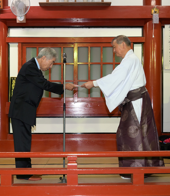赤尾最高顧問より日本美術作品奉納目録を 湯澤権宮司に贈呈する模様