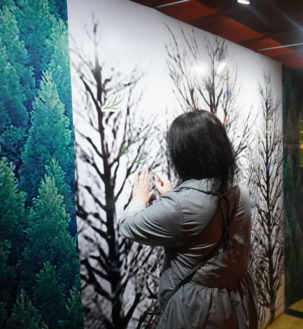 それは、客殿展示会場内に枯れた杉木のデザインを施したパネルに来場者の方々が緑の杉葉のステッカーを貼るという自然保全の心を示して頂く参加型イベントを行ったことと、本展覧会インスタグラムに会場内の様子や好きな作品をアップロードしていただくことで、自然に因みハーブの栽培セットをプレゼントするといったことではないかと弊会は理解しております。 受付に来て、楽しそうにアップロード画面を見せる鑑賞者が多く見られ、私ども全てのスタッフが同じく楽しんでいたことが、本展を成功裡に導くのではないかと当時、本文筆者は確信いたしました。