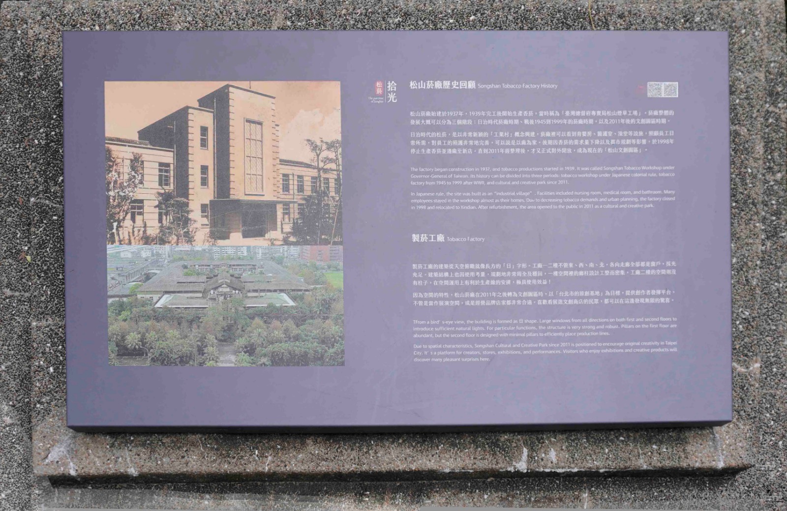 嘗て、日本が統治した時代の「臺灣總督府専賣局松山煙草工場」の館銘板(右写真)が残されています。専売局となっていることで専売公社に繋がるイメージが湧いてきます。左写真は、煙草工場当時の建物の写真や歴史が記されております。現在の「松山文創園區」は、ほぼ当時のままの建物を活用し、日台友好の証としてそのままの姿が残されているようです。