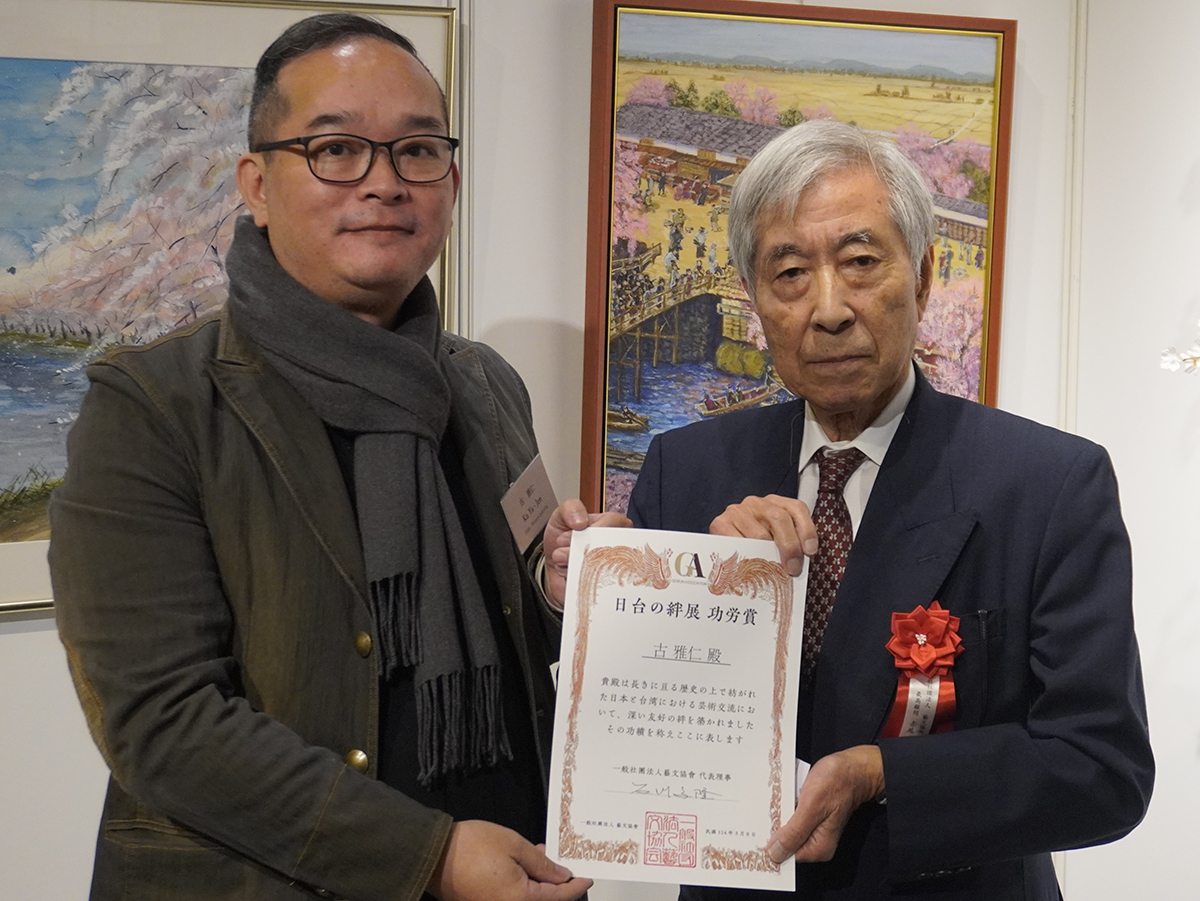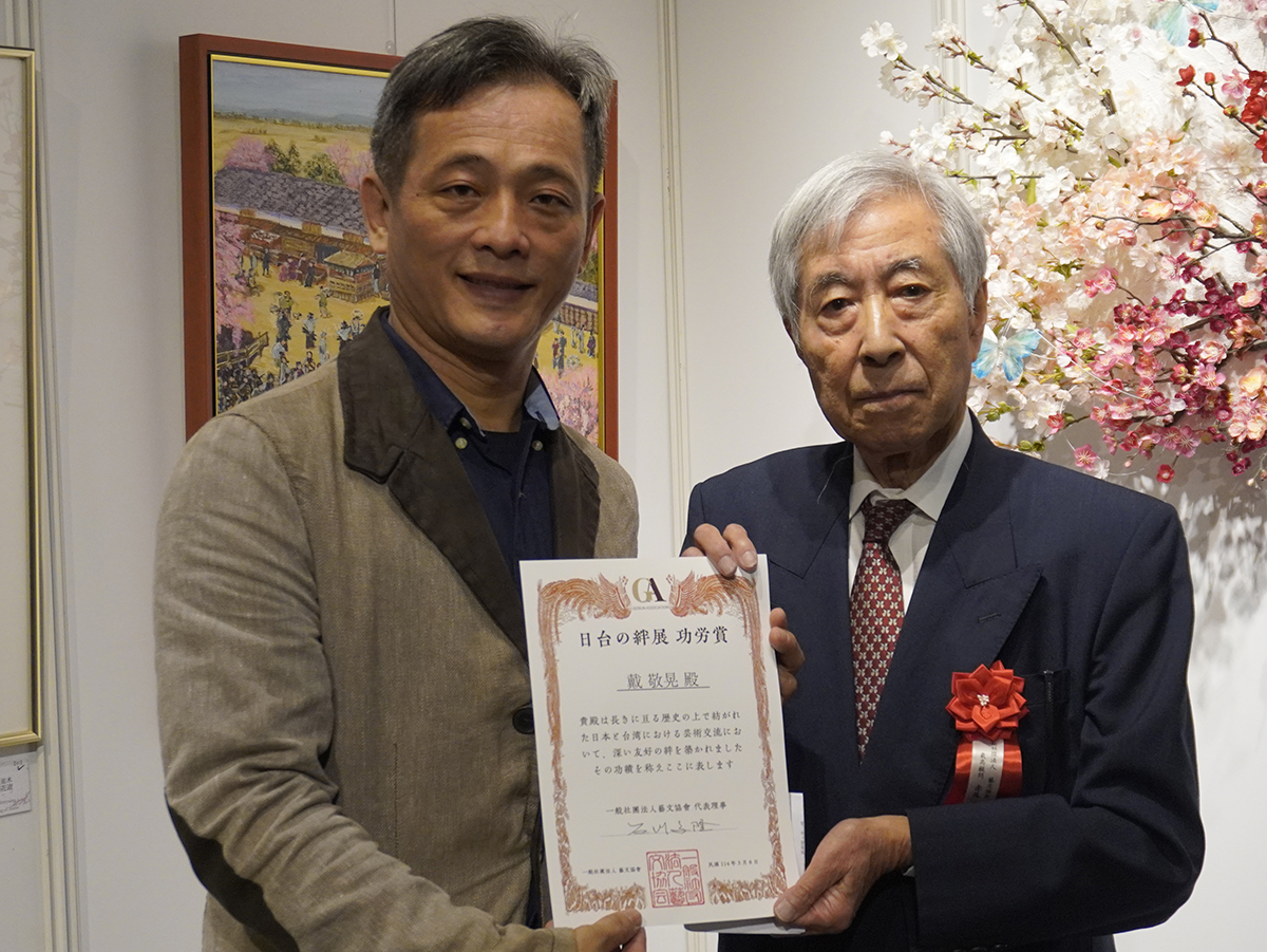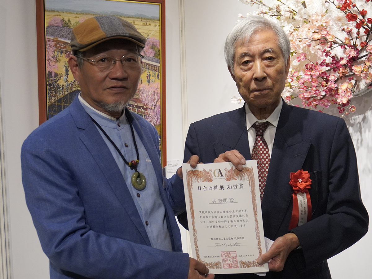 主催藝文協会赤尾信敏最高顧問から台日美術家へ「日台の絆展功労賞」が授与されました。 初めに台湾美術家から賞状が受け渡されました。