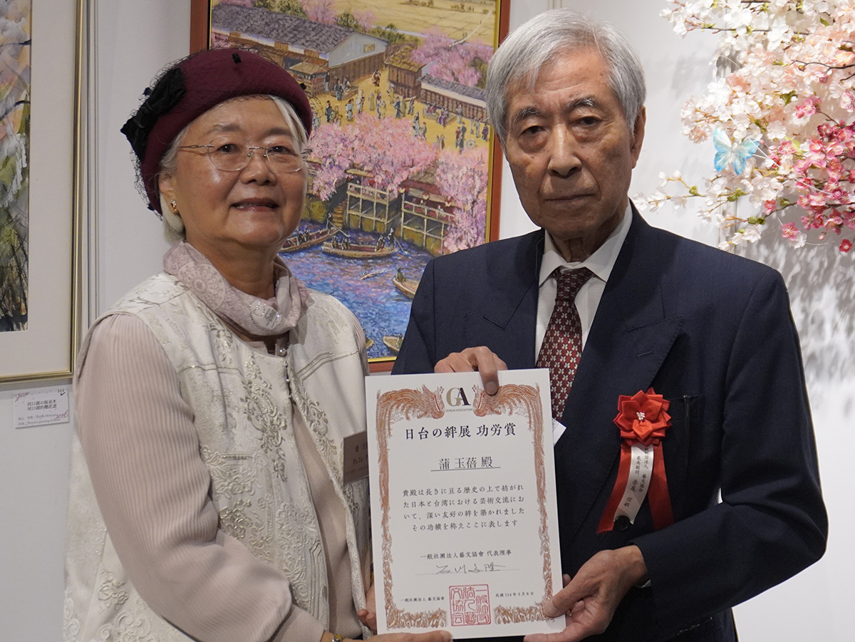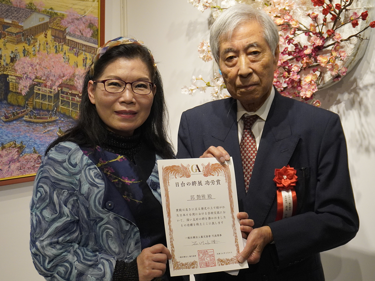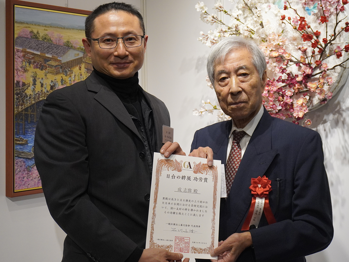 主催藝文協会赤尾信敏最高顧問から台日美術家へ「日台の絆展功労賞」が授与されました。 初めに台湾美術家から賞状が受け渡されました。