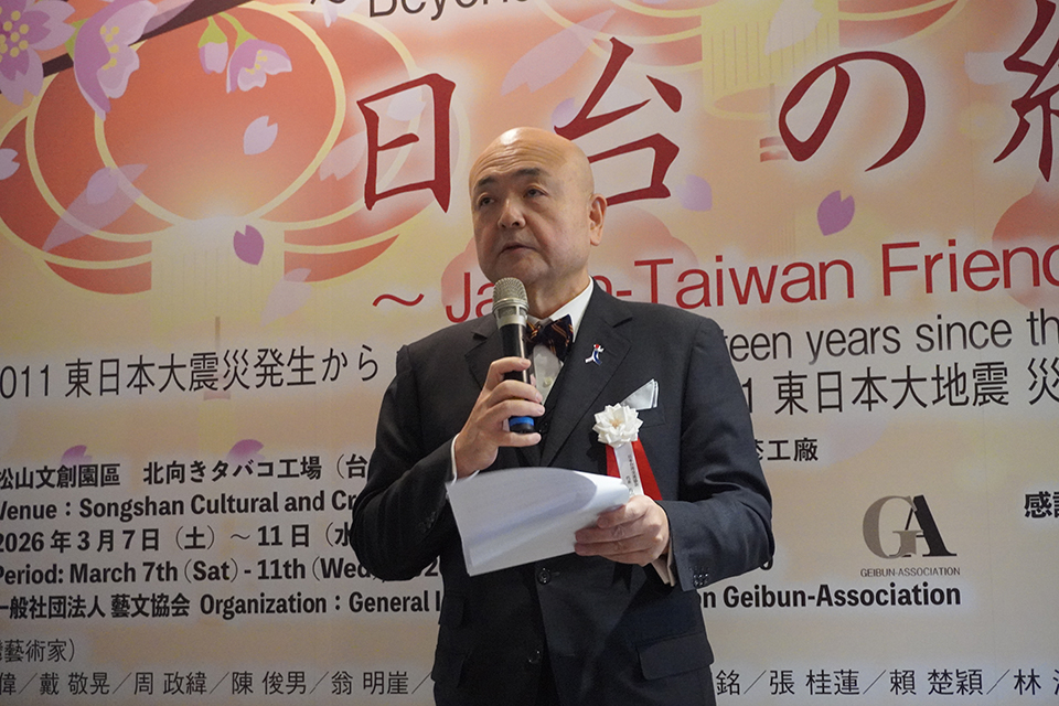 今回の美術展には日本と台湾の芸術家作品がおよそ200点が展示されております。両国の芸術家の皆様にこの場をお借りして御礼を申し上げます。今回の美術展を通じて、皆様の交流を機会に日本と台湾の友好関係や相互理解が一層深まることを願う次第であります。(一部要約)