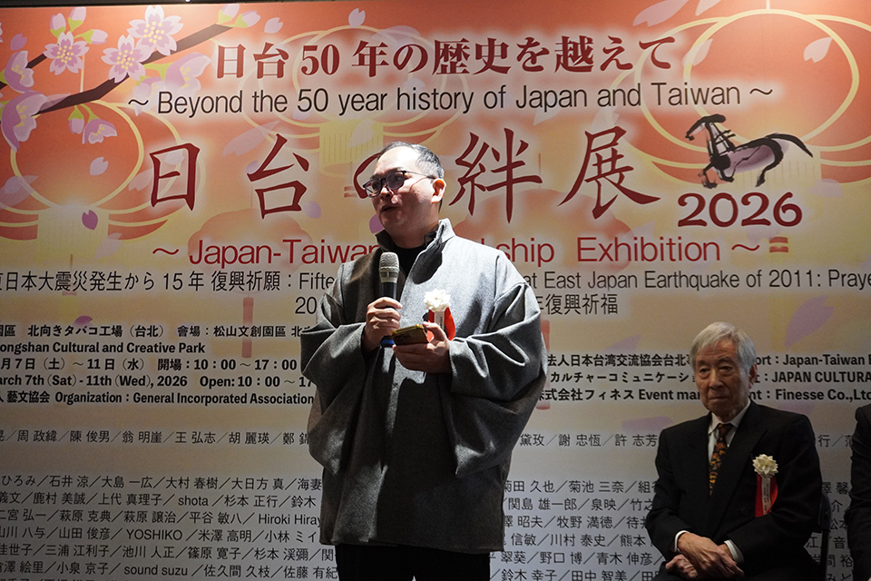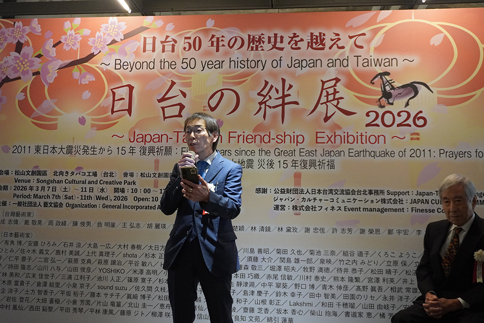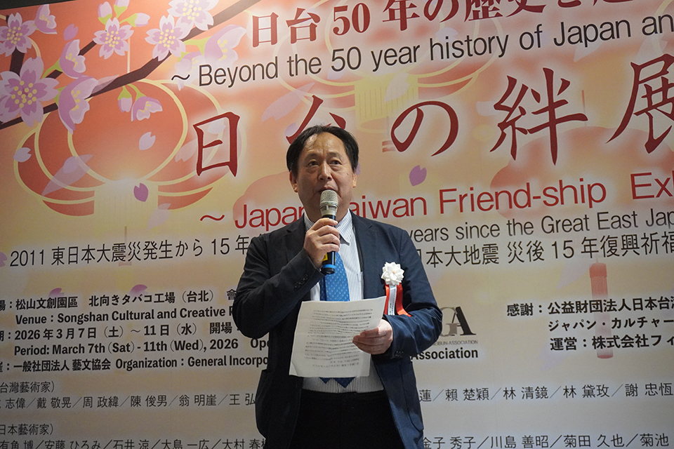 一般社団法人藝文協会最高顧問赤尾信敏様、元在リトアニア日本国特命全権大使重枝豊英様、台湾芸術家代表の古雅仁様、そしてご臨席の皆様、こんにちは。本日は日台の絆展2026にお招きいただきまして誠にありがとうございます。今回は日本台湾交流協会を代表いたしまして外務省の尊敬すべき諸先輩方、ならびに台湾の来賓の方々の前でご挨拶できることをとても光栄に思います。振り返りますと間もなく東日本大震災15年となりますが、その際に台湾の方々からいただいた温かいお見舞いと多額の義援金は日本人として決して忘れることはございません。