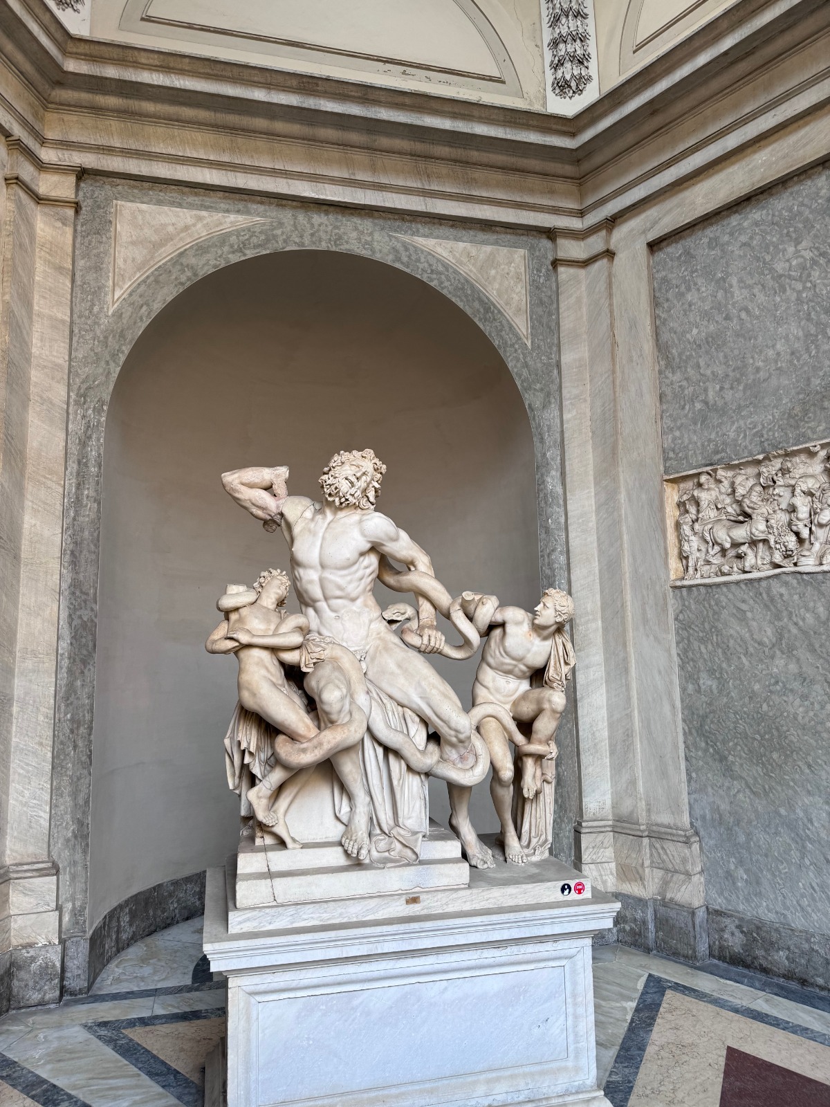 11月9日観光 この日は、全世界のカトリック教徒の総本山とも謳われる世界遺産バチカン市国に訪問。 初めはバチカン美術館を見学し、有名な彫刻ラオコーンやラファエロの間で、ルネサンス期の傑作を堪能した。 次に若き日のミケランジェロの傑作「ピエタ」があるサンピエトロ大聖堂に行くも、残念ながらお目当てのピエタは修復中であったが、絢爛豪華なバロック建築様式の大聖堂の荘厳かつ煌びやかな様相を堪能した。 少し離れた場所にある最後の訪問先は、映画「ローマの休日」でも有名な「真実の口」(ボッカ・デラ・ベリタ)。実際にはマンホールの蓋であるが何故か懐かしさを感じるものがあった。