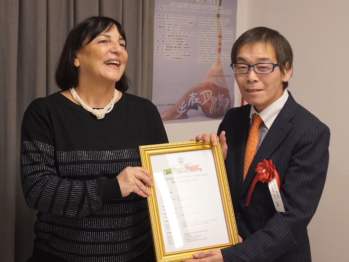 藝文協会代表石川文隆よりクロチェッティ財団オルトラーニ会長へ授与されました。(展示作品中14点)